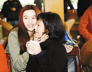 本報(bào)成都專電 由女導(dǎo)演李玉執(zhí)導(dǎo),范冰冰、陳柏霖、張艾嘉主演的電影《觀音山》正在成都熱拍,昨日,劇組在位于成都龍泉驛的拍攝地接受媒體探班,首次合作的內(nèi)地美女范冰冰和臺(tái)灣才女張艾嘉親密無間,在有記者稱她們兩個(gè)有點(diǎn)“不搭”時(shí),范冰冰還特意走上前來,給張艾嘉一個(gè)親吻。