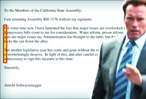 湯姆·阿米阿諾與幾位議員提出了一項法案,希望加州能在舊金山地區創建基礎設施融資區,采取融資計劃推動這些地區的基礎設施建設。通常此類法案如果不是問題太多的話,州長會予以批準。但湯姆·阿米阿諾與施瓦辛格素來看不對眼,本月初又在集會上批評施瓦辛格的施政方式,還大罵他是“騙子”。施瓦辛格否決了這項提案,并在否決信上以藏頭詩的形式對阿米阿諾議員予以反擊,即信件每行第一個字母連起來就是“T(Tom),I f k you,A(Arnold Schwarzenegger)”。州長辦公室新聞發言人稱此事純屬巧合,“試想每天寫那么多否決信,這種巧合的出現是遲早的事。”