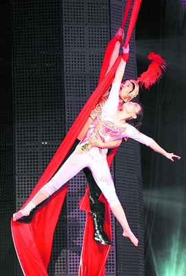 而整個節(jié)目的高潮,是在小沈陽換上露臍的盔甲裝,演唱電影《神話》主題曲。除了賣力演唱,他還在舞臺上玩了次“武俠”,手抓紅綢緞,抱著女演員在工體館上空飛來飛去,引得全場尖叫。
