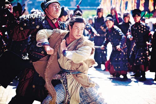 如果說被鋼絲吊在半空“飛”難不倒小沈陽,那么接下來的打戲則是難度不小,因為小沈陽聲稱不必用替身,而程小東又是有名的較真導演,對動作細節的要求之苛刻達到“令人發指”的程度,因此小沈陽接受了更大的挑戰。這段時間橫店悶熱難耐,有一場小沈陽殺進皇宮英雄救美的戲,對手演員是片中大反派——第一高手徐少強。這種天氣穿著厚厚的古裝拍戲,即便站著不動都會汗流浹背,何況還是拍動作戲,當小沈陽在程導的指揮下一遍遍拳打腳踢、跳躍騰挪后,早已是揮汗如雨,幾乎每拍一個鏡頭都要換下一身汗濕的戲服。