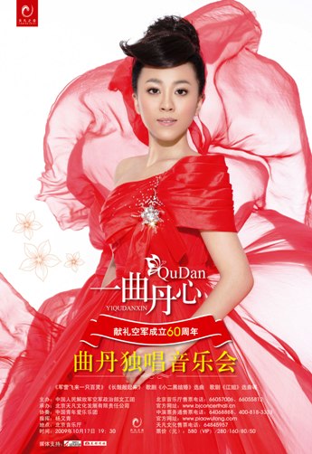 中新網10月12日電 為了慶祝中國人民解放軍空軍成立六十周年,空軍政治部文工團(以下簡稱:空政)獨唱演員曲丹將于本月十七日,在北京音樂廳舉行個人專場音樂會。
