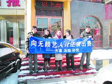 昨日上午,沈陽一文化公司的5名員工在北三經街鬧市區拉出條幅:“向無賴藝人討還演出費!”條幅下列出了三名藝人的姓名:齊秦、湯燦、孫悅。