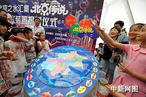 “北京之水匯集北京傳說”活動是圍繞北京兒藝六一大戲《北京傳說》中的節(jié)水環(huán)保主題而開展的、面向北京所有小學生及學齡前兒童的大型環(huán)保節(jié)水公益行動。現(xiàn)場12位節(jié)水小明星代表一起把他們從北京各水系取來的水標本匯集到“北京之水”大型環(huán)保容水裝置中,這一裝置高1.5米,它以藍色水波紋狀物體為底座,上方圓弧狀轉(zhuǎn)盤中用顯著顏色標識出北京水系分布情況,5月28日至6月1日《北京傳說》演出期間,該容器將放置在水立方場內(nèi),成為一道環(huán)保新景觀。