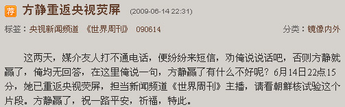這兩天,媒介友人打不通電話,便紛紛來短信,勸俺說說話吧,否則方靜就贏了,俺均無回答,在這里俺說一句,方靜贏了有什么不好呢?6月14日22點15分,她已重返央視熒屏,擔當新聞頻道《世界周刊》主播,請看朝鮮核試驗這個片段。方靜贏了,祝一路平安,祈福,特此。