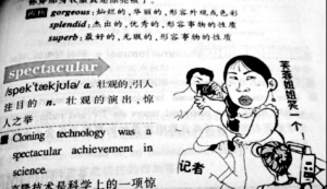 臺灣“今日新聞”消息稱,英文書中芙蓉姐姐的漫畫像斜眼、噘嘴不屑一顧的模樣,還有記者環繞在旁,右邊寫著“芙蓉姐姐笑一個”,左邊則出現英文單字“spectacular”,翻成中文是形容詞壯觀的、引人注目的以及名詞驚人之舉,夸張的畫像和本尊幾乎一模一樣,芙蓉姐姐卻說教科書把她畫丑了,而網友則是驚呼不可思議。