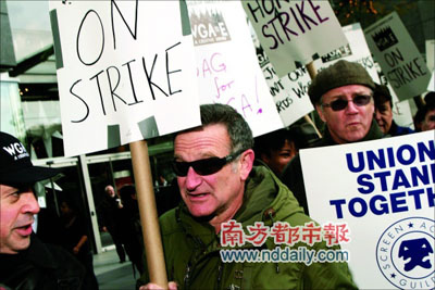 當(dāng)?shù)貢r間11月8日下午,在電視劇《丑女貝蒂》(uglybetty)的拍攝地點——Raleigh影棚外,此劇的演員們加入到編劇們的抗議隊伍中,高喊口號,“不要貪婪!不要吝嗇!《丑女貝蒂》將消失熒屏!”除此之外,成員都是大牌明星的演員工會也在當(dāng)日加入抗議隊伍,連奧斯卡終生成就獎獲得者羅賓·威廉姆斯都高舉紙牌表示支持。