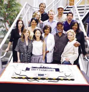 描寫醫務人員生活的熱門美劇《實習醫生格蕾》日前完成了第100集的拍攝工作。劇組在洛杉磯的片場舉辦了一個慶祝派對,并特意準備了一個帶有“聽診器”、 “手術刀”等圖案的大蛋糕。包括帕特里克·德姆西、桑德拉·歐、凱瑟琳·海格爾(前排右一)等主演均到場留下了“全家福”。