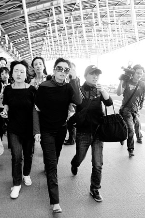 等賈靜雯一走出通道,媒體立即蜂擁而上。其內地經紀公司委派的兩名助理,立即上前將其左右護住。
