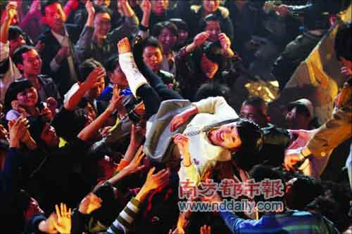 周迅在片中號稱飾演12個角色,當天她的戲份卻非常獨特:在搖滾演唱會現場,人群中忽然躁動起來,歌迷以搖滾演唱會上最常見的人體輸送帶的方式將她傳送到了舞臺上!而周迅的腳上竟然打著石膏繃帶。