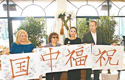 章子怡(右二)與數名外籍人士手持“祝福中國”的簽名卡,以示心系家鄉。