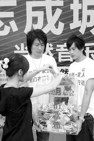 昨天,游鴻明、何潤東、陳怡蓉、沈建宏、鄧寧、劉錫明、阿清、高磊、晨辰等當然音樂的歌手抵達重慶。他們帶著70余萬元的救災物資和9顆愛國之心在重慶街頭為汶川地震的災后重建募款。在重慶石橋鋪佰騰數碼廣場、沙坪壩步行街、江北北城天街三個募捐點,累計3小時的募款活動中,何潤東等9位藝人共籌集善款187400余元,目前這個數字還在不斷增加。