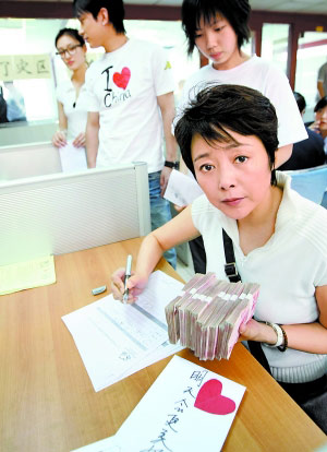 前天,從寧波外景地直接趕回北京的著名演員張瑜,從北京機場直接來到中國扶貧基金會,為汶川災區(qū)的孩子們再捐10萬元善款。和張瑜一道同來的還有張瑜導演的電影《八十一格》的兩位青年主演王麗坤和王睿。張瑜說,10萬元對災區(qū)人們來說,也許是杯水車薪,但現(xiàn)在災區(qū)孩子需要的不僅僅是錢,他們更需要心靈醫(yī)治和撫慰。