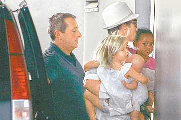 皮特(左三)日前抱兩個女兒到醫院看茱莉,保鏢(左一)在旁護駕。