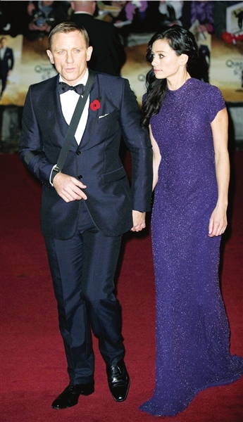 由于在拍攝中受傷,他在走上紅地毯時胳膊仍打著石膏夾板。在片中繼續(xù)飾演“M”的英國女演員朱迪·登奇,以及兩位“邦德女郎”、烏克蘭演員兼模特奧莉加·庫里連科和英國演員杰瑪·阿特頓也出席了首映式。