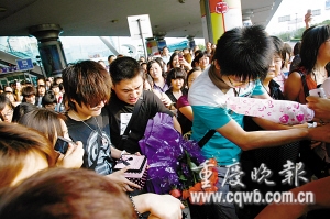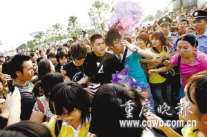 李宇春昨日抵達重慶江北機場,并將于今日在北碚參加一慈善活動。玉米們聞風而來高調接機。由于李宇春沒有走玉米們用人墻組成的通道,導致以講秩序著稱的玉米出現混亂場面。