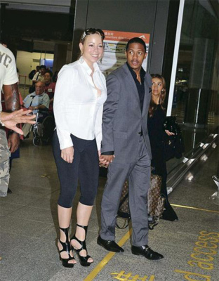 瑪麗亞·凱莉與丈夫步出機(jī)場(chǎng)。圖片均來自香港《明報(bào)》
