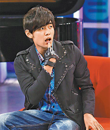 在新專輯封面化身奇幻戰士的周杰倫,昨錄像時露出逗趣表情。