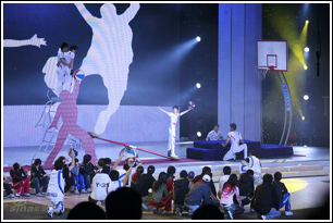 上半場聯排下來,有幾個非“主流”節目令人印象深刻。沈陽軍區前進雜技團表演的雜技《花式籃球》,演員們用嫻熟的技巧,把NBA賽場上球星們最迷人的“飛躍式灌籃”和花式籃球技巧,與雜技“跳板”的借力翻騰完美結合,他們在距離地面六七米的高空翻滾后完成扣籃動作,其中一個雜技演員還表演了手腳各執一球、先后投籃的高難度動作,令人叫絕。
