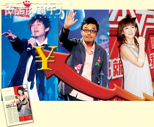 回到“2007主持人商業(yè)收入排行榜”,除了排名第六位的倪萍,前十強(qiáng)的其余九位都主持過湖南衛(wèi)視的節(jié)目,李湘、汪涵、何炅、謝娜均榜上有名。李湘近年發(fā)展重心移到北京,汪涵、何炅、謝娜成為湖南衛(wèi)視真正的臺(tái)柱子,超女、快男三戰(zhàn)下來,三人的全國影響力一日千里。在這份商業(yè)榜上,即便是排名第十的謝娜,榜單公布其2007年的收入也約為830萬元,而不久前公布的“2007湖南娛樂圈財(cái)富榜”上,何炅、汪涵分別以780萬和620萬年收入位居榜首和探花。2007年福布斯內(nèi)地名人榜中,三人也分別躋身前一百位,紛紛挺進(jìn)千萬俱樂部。在接受本刊訪問時(shí),汪涵不諱言自己是湖南臺(tái)簽約主持人中身價(jià)最高的,而何炅則坦率承認(rèn)自己是“編外”人員中最能吸金的。