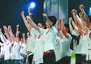 募捐晚會現(xiàn)場,眾星齊唱《愛的奉獻》。 圖/央視國際
