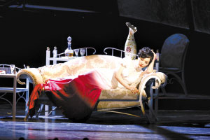 對(duì)此,導(dǎo)演王延松表示,“鳥巢”并不新鮮,倒是由一端底處逐漸盤旋上升到另一端中高處的一長(zhǎng)段樓梯形成的“腰線”比較特別,是一個(gè)原創(chuàng)。演出中,陳白露經(jīng)常要在這段樓梯跑上跑下,為整部《日出》穿針引線。華麗場(chǎng)景與三等劇院的變換,也巧妙地利用了帷幔、燈光,用燈光下映襯在幔布上的演員的剪影與舞臺(tái)上演員的身影,相互呼應(yīng)、巧妙相連。