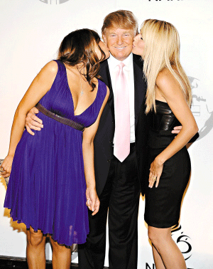 唐納德·特朗普接受妻子(左)和名模海蒂·克魯姆的吻賀。