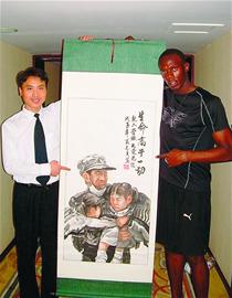 牙買加飛人博爾特在奧運會百米決賽中以9秒69震驚世界,昨日記者獲悉,博爾特與山東濟寧的一位農(nóng)民畫家還有一段小故事——— 奧運開幕前夕,博爾特隨牙買加體育代表團在天津訓練時,濟寧畫家房貽德特意托人向博爾特贈送了一幅抗震救災題材國畫,博爾特欣然接受,并回贈了一件他的簽名運動服。