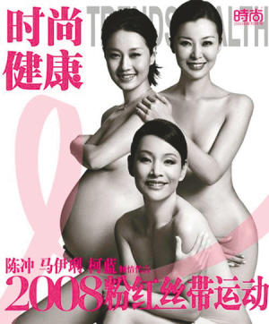 以關(guān)愛女性健康為宗旨的“粉紅絲帶行動(dòng)”每年都會(huì)找一些女星來作宣傳。今年他們找來了懷胎9月的馬伊琍和陳沖、柯藍(lán)則拍攝了一組全裸照片,展現(xiàn)女性的自信和美麗。這組照片于日前公開刊發(fā)在《時(shí)尚健康》雜志上。