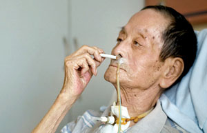 因為長期抽煙,范老的肺不是很好。住院以后,由于長期不活動,抵抗力下降,肺部受到感染。今年2月份,醫院為范老實施了氣管切開術。