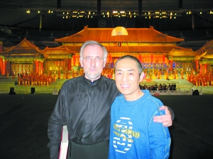 張藝謀版歌劇《圖蘭朵》在巴黎公演前,張藝謀(右)與世界著名指揮大師雅諾什·阿克斯在演出舞臺(tái)前合影。