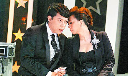 阿妹(右)錄像前和蔡康永互抵著頭認真研究流程。