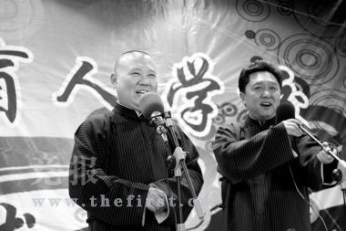 從窗戶望出去,能看到山,這種景致讓許多身處都市的人心動。但是,窗子邊的孩子們卻看不到這種景致,他們是北京市盲人學校的盲童。昨日,這些看不到美麗風景的盲人孩子卻聽到了令人捧腹的相聲——郭德綱和搭檔于謙、師弟高峰等人帶來一場快意的演出。