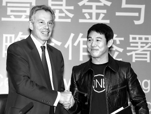 昨天上午,李連杰與氣候組織發起人之一、前英國首相托尼·布萊爾在北京短暫會面,簽訂了壹基金與氣候組織在環境領域的合作協議。李連杰表示,氣候變化在未來環境下是個極大的挑戰。他今天與布萊爾探討了在未來的時候我們要減少多少能源,消費者可以怎樣改變生活理念等問題。希望借由壹基金和氣候組織的共同努力,提高人類對節能減排的認識。記者 楊蓮潔/文 鄒紅/攝