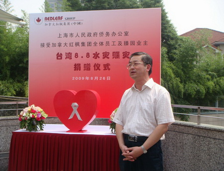 8月26日上午,上海市政府僑辦接受加拿大紅楓集團向臺灣受災地區捐贈儀式在臻園別墅舉行。加拿大紅楓集團董事長周正寬先生、馬絢華女士代表集團,通過上海市政府僑辦向臺灣受災地區捐款人民幣30萬元。副總經理丁道恒等代表全體員工捐款人民幣1.7余萬元。臻園別墅業主也在活動現場進行了捐款。上海市政府僑辦主任崔明華出席活動并講話。