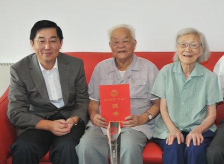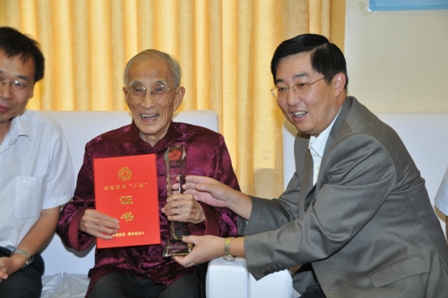 喬衛(wèi)向兩位院士介紹了中國僑聯(lián)組織及與國務(wù)院僑辦聯(lián)合開展“全國僑界十杰”評獎的情況,仔細(xì)詢問他們的工作生活和健康狀況。喬衛(wèi)代表中國僑聯(lián)向吳文俊院士和顏鳴皋院士頒發(fā)了“全國僑界十杰”獎杯和證書,并祝愿兩位院士健康長壽,生活愉快。