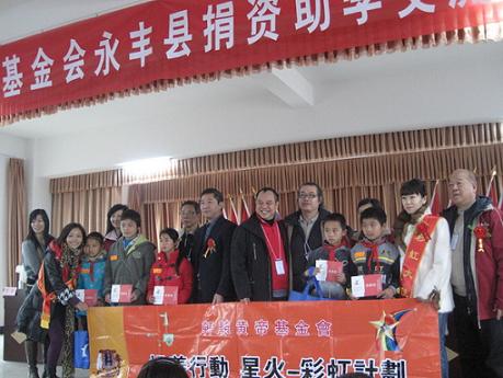 香港龍山基金會屬于非營利性慈善組織,由江西省港澳區政協委員鄧國容先生會同有識之士創建,多年來該基金會一直關注永豐縣教育事業、關注永豐縣貧困學生。星火——彩虹計劃是由龍山基金會和軒轅黃帝基金會聯手創辦的助學扶貧計劃,主要是扶持江西省革命老區、少數民族地區及貧困山區的文教事業。自2004年起,星火——彩虹計劃已經組織了多次“贛港心連心”江西訪問交流團來該縣開展捐資助學活動。累計已援建龍岡畬族鄉中心小學教學樓、瑤田鎮三灣小學軒轅黃帝教學樓、八江鄉高家小學軒轅黃帝教學樓、潭頭鄉楊梅江小學白求恩教學樓,資助金額42萬元;資助全縣21個鄉鎮貧困學生400人次,資助金額12萬元;捐助教學用品及學生學習、生活用品折合人民幣達5萬多元。