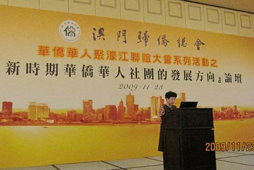 中新網(wǎng)12月2日電 據(jù)江蘇省僑聯(lián)消息,11月23日至24日,以江蘇省僑聯(lián)主席郁美蘭為團(tuán)長(zhǎng)的江蘇省僑聯(lián)代表團(tuán)一行3人出席了在澳門舉行的“2009華僑華人聚濠江聯(lián)誼大會(huì)”。