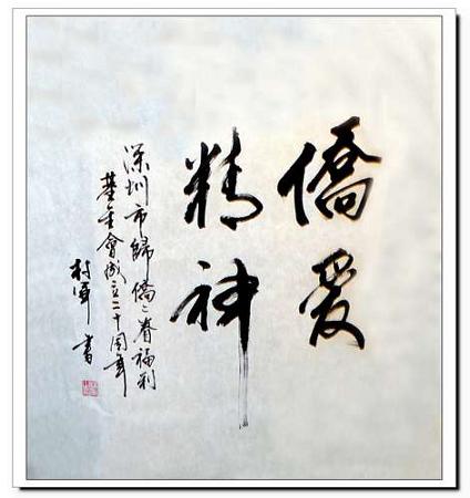 根據(jù)年初深圳市僑聯(lián)常委會(huì)的會(huì)議精神及市歸僑僑眷福利基金會(huì)的工作計(jì)劃,基金會(huì)將舉辦市歸僑僑眷福利基金會(huì)20周年紀(jì)念活動(dòng),以對(duì)所有支持關(guān)心過基金會(huì)的領(lǐng)導(dǎo)和社會(huì)知名人士表示感謝,并出一本基金會(huì)紀(jì)念冊(cè),以紀(jì)念基金會(huì)成立以來的風(fēng)雨歷程。當(dāng)參加廣東省第九次僑代會(huì)的廣東省僑聯(lián)常委、深圳市歸僑僑眷福利基金會(huì)副理事長(zhǎng)劉偉良邀請(qǐng)林軍為市歸僑僑眷福利基金會(huì)題詞時(shí),林軍欣然應(yīng)允,當(dāng)即揮筆疾書“僑愛精神”,為市歸僑僑眷福利基金會(huì)成立20 周年獻(xiàn)禮。