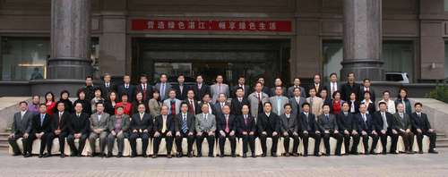 湛江市領導陳耀光、阮日生、李康壽、趙志輝、鄧振新和湛江市僑聯主席梁春明等有關部門領導與訪問團團長、湛江旅港同鄉聯合總會會長、香港太平紳士、廣東省僑聯顧問許晉奎先生,澳門湛江同鄉總會會長、廣東省僑聯榮譽委員、訪問團副團長莫一夫先生以及香港中聯辦人事部副部長楊茂、港島工作部副部長冼源、九龍工作部副部長何靖等一起座談交流,暢敘鄉情,共商發展大計,并與訪問團全體成員合影留念。