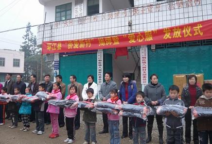 出席揭牌儀式的領導還向明倫鎮八面、八合小學及環江縣特教學校400多名師生發放了胡家儀先生及其公司捐贈的御寒羽絨服。(莫棉荷)