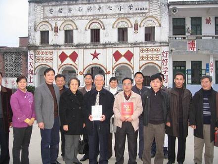 當天下午,年近九旬的莊炎林,不顧旅途的疲勞,在梧州市僑聯主席鐘小欣、蒼梧縣統戰部部長李燕芬等領導的陪同下,來到蒼梧縣石橋鎮中心小學考察。其中心小學是莊炎林先生在抗日戰爭期間,以教師身份掩護開展地下工作的地方。今日重游故地,莊炎林先生格外激動,并向陪同人員講起了當年的工作情景。隨后莊炎林先生一邊聽取該學校的情況,一邊參觀當年曾用過的工作室,并在留言簿上題詞:為國利民,奉獻力行。(蔡光天)