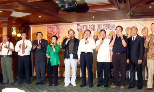 中新網2月22日電 據《南美僑報》報道,為了歡迎到秘魯訪演的“文化中國·四海同春”南美藝術團,以中華通惠總局為首的利馬各華人社團,21日晚在富臨門酒店舉行盛大歡迎晚會,國務院僑辦副主任馬儒沛、中國駐秘魯大使趙五一和通惠總局三位主席蕭孝權、周銳波、楊學勤等近五百人出席了晚會。