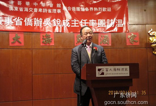 宴會上,中華會館等主要社團的負責人、海外理事代表紛紛做了熱情洋溢的歡迎辭,對廣東省僑辦主任吳銳成一行務實、深入、高效、不辭勞苦的工作表示由衷的欽佩和贊賞。吳銳成在發(fā)言中感謝僑胞們對訪問團的熱情接待和大力支持;向僑胞們詳細介紹了這次訪問的目的,一是向僑胞們拜年,二是報告中國特別是廣東的社會經(jīng)濟發(fā)展情況,三是感謝僑胞們對中國以及廣東發(fā)展所作的貢獻,四是聽取僑胞的意見;再次表示今后廣東省僑辦要在關注華僑華人生存發(fā)展、維護華僑華人合法權益、支持社團的革新與發(fā)展、支持華僑華人融入主流社會、支持華社開展華文教育、傳承中華文化等方面做更多的工作。吳銳成務實為僑、熱情洋溢的精彩發(fā)言得到了共鳴,贏得了陣陣掌聲。