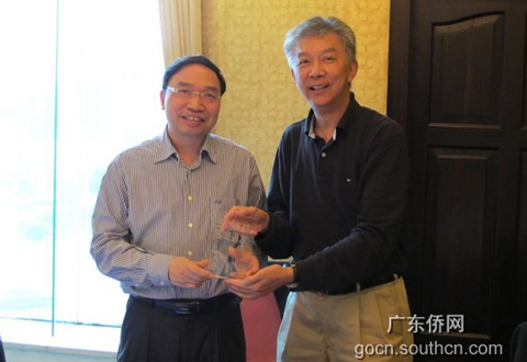 星島日報海外業務董事總經理詹瑞慶向廣東省僑辦副主任林琳贈送紀念品