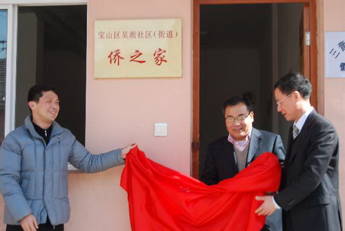 寶山區委統戰部副部長、區僑辦主任黃忠華,區僑聯主席曹晉和,吳淞社區(街道)黨工委副書記徐子平等人共同為吳淞“僑之家”揭牌,并向僑界世博志愿者隊授旗。