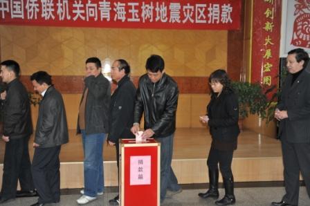 中國僑聯副主席李祖沛現場傳達了中共中央政治局委員、全國人大常委會副委員長王兆國對僑聯開展玉樹抗震救災的指示精神和林軍對玉樹抗震救災的批示精神,指出要把廣大歸僑僑眷和海外僑胞支援抗震救災的熱情引導并融入黨政主導的抗震救災行動中去,并號召機關廣大干部職工要大力發揚“一方有難、八方支援”的精神,心系災區、情系災民,以實際行動幫助災區群眾渡過難關。隨后,舉行了中國僑聯機關向青海玉樹地震災區捐款活動。中國僑聯黨組書記、主席林軍、副主席李祖沛、董中原、王永樂帶頭向災區捐款,出差在外的副主席喬衛也委托他人捐款。
