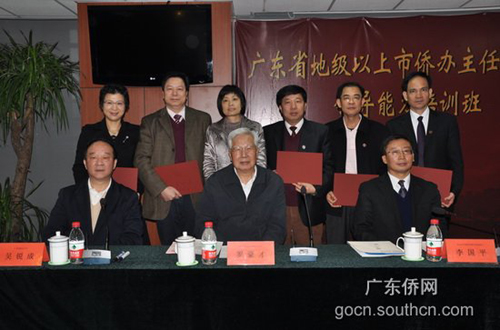 中新網4月23日電 據廣東僑網消息,4月22日上午,廣東省地級以上市僑辦主任(局長)領導能力培訓班舉行結業(yè)典禮。原全國政協(xié)副主席、北京大學政府管理學院院長羅豪才出席了結業(yè)典禮并與全體學員合影留念。