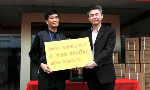 廣東逸舒制藥有限公司董事長黃慶文出差在外,當他接到市僑聯的倡議后,第一時間表達了向玉樹災區捐款捐物的意愿。他急災區群眾之所急,立即組織企業員工加班加點,加量生產大批災區急需的抗生素等藥品,并特地委托公司總經理黃慶雄參加捐贈儀式捐贈藥品。儀式上,肇慶市僑聯主席黃志堅向廣東逸舒制藥有限公司及其全體員工對積極參與捐贈活動表示衷心的感謝;他指出,災害無情,人間有愛,我們雖遠離玉樹,但與災區人民感同身受,此刻奉獻一份愛心,盡一份綿薄之力是我們情系災區最好的表達方式。隨后,黃慶雄總經理代表公司把藥品和善款親自交到市紅十字會主任徐永飛手中,為感謝廣東逸舒制藥有限公司的善舉,市紅十字會也回贈了“紅十字愛心單位”牌匾。