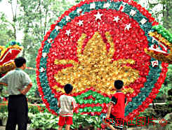 隨著澳門回歸時間日益臨近,中國內(nèi)地慶祝氣氛漸濃。四川省宜賓市流杯池公園內(nèi),用數(shù)千個民間工藝制作的飛輪扎成慶澳門回歸造型,分外引人注目。